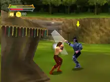 The player controls Hercules and his friends, Iolaus and Serena, to free Zeus against the forces of Area and Hera and their minions.[4] The Nintendo 64 version of Hercules integrates elements of platform, role-playing and adventure games.[5] Players control characters to complete combat, quests and puzzles, with each having unique abilities, such as Hercules' ability to throw items, Iolaus' ability to reach otherwise inaccessible places, and Serena's ability to use ranged weaponry.[4] Combat is straightforward and uses direct attacks against player and enemy "life energy", as well as a "magic menu" to cast magical powers as a special ability. The game features twelve locations and five arenas.[6] The Game Boy Color version of Hercules differs slightly from the Nintendo 64 version. The game is played in mixed perspectives as an overhead and side-scrolling action-adventure game.[7] The Game Boy version also contains the notable feature of being able to use the Game Link Cable with a system playing Xena: Warrior Princess to switch the characters in the game and unlock secret levels.