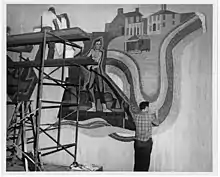 Here I Grew Up is a mosaic mural on a travertine marble wall that measures 70 ft. in length and 25 ft. in height.[1] It contains over 300,000 hand-cut pieces of Bysantine Smalti (Glass tiles) in 87 different hues.[1] These tiles measure approximately 3/8" x 5/8" x 1/9" thick[1] and were imported from Murano, Italy. The design for the mural was chosen as a winning entry for an art competition held in December 1959, by the Indiana State Office Building Commission.[2] Antreasian's mural entry, along with Young Abe Lincoln (sculpture) by David Rubins, was selected by a jury to commemorate Abraham Lincoln's formative years in Indiana.[1] Antreasian's full-scale color drawings of the Abraham Lincoln figures took six months to complete.[3]