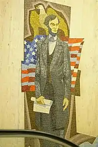 The fabrication of the mural was completed by Herron School of Art graduate Ralph Peck and his assistant, Mrs. Charles Pitts.[2] Before Peck and his assistant began their work, the marble wall in the Indiana Government Center North was sandblasted to proper depth by using a full-size sketch of the mural as a guide.[1] Peck and his assistant then affixed the glass tiles to the reverse side of Antreasian's sketches that were printed on a large roll of paper. The pair then cut out each Lincoln section, called a cartoon, and coded the square and rectangle pieces for coloring and positioning.[1] It took one year to set the pieces in mortar.[2]