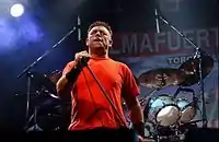 The musical style of Hermética was considered to be old-fashioned. The band achieved success as a result of their introspective lyrics.[22] Unlike most heavy metal bands, Hermética's music was appealing to poor people.[24] Iorio wrote about his thoughts and concerns from a personal perspective.[24] He stated that some of his lyrics were inspired by 1940s Argentine tango music.[23] Hermética was part of the Rock chabón movement within Argentine rock; their music was influenced by Argentine nationalism, family values and neighbourhood-centered localism.[25] Iorio said that he does not support racism or fascism.[1] The lyrics, except for covers, were always written in Spanish because Iorio does not approve of artists who write in English to gain foreign audience.[13] The first two albums addressed a variety of topics; the track "Memoria de siglos" ("Memory of centuries") references the cult of personality, buck passing, peace through strength, and wage slavery. Each song from their third album is devoted to a different subject.[23]