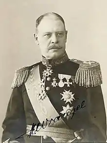Wrangel was promoted to sub-lieutenant (löjtnant) in 1883 and two years later he was called up for service in the General Staff and continued partly there, partly in the Fleet Staff until 1889, when at the same time as his appointment as captain he was commanded to serve as an adjutant in the Military Office of the Ministry for Naval Affairs, which position he held until 1891.[2] In the spring of 1889 he was also posted as a substitute teacher on board cadet ships and maintained this position for three summers in a row and then for seven years he maintained the position as a regular teacher in navigation at the Royal Swedish Naval Academy. In 1893 he also became a teacher in naval warfare after the then lieutenant Wilhelm Dyrssen, and retained this post until 1901. In 1895 he had also been appointed teacher of naval science at the Royal Swedish Army Staff College, in 1898 as teacher of strategy at the Royal Swedish Naval Academy and in 1900 as teacher of tactics at the same educational institution.[2] During his work as a teacher at the Royal Swedish Naval Academy, Wrangel invented and designed a new solution to the problems of astronomical navigation (location determination through two altitude observations), which were then still widely used by Swedish navigators.[3] Wrangel was promoted to lieutenant commander and was posted as head of the Communications Department in the Fleet Staff from 1900 to 1901.[5] After finishing his teaching career at the Royal Swedish Army Staff College in 1903, he also resigned from his remaining teaching positions in the spring of 1906.[2] Wrangel served as flag captain of the staff of the Commander-in-Chief of the Coastal Fleet from 1904 to 1907.[4] He was promoted to captain in 1907 and to major general in 1909 and appointed commander of the Swedish Coastal Artillery. He was promoted to lieutenant general in 1916 and went on a study trip to the Western Front in 1918.[6] He left active service in 1924 and entered the reserve from which he left in 1932.[4]