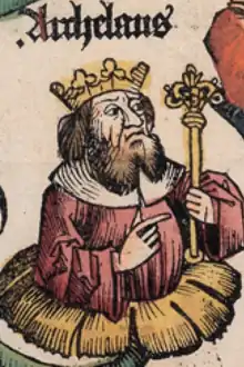 Herod Archelaus (Ancient Greek: Ἡρῴδης Ἀρχέλαος, Hērōidēs Archelaos; 23 BC – c. AD 18) was the ethnarch[1][2] of Samaria, Judea, and Idumea, including the cities Caesarea and Jaffa, for nine years[3] (c. 4 BC to AD 6). He was the son of Herod the Great and Malthace the Samaritan, brother of Herod Antipas, and half-brother of Herod II. Archelaus (a name meaning "leading the people") came to power after the death of his father Herod the Great in 4 BC, and ruled over one-half of the territorial dominion of his father. Archelaus was removed by the Roman emperor Augustus when Judaea province was formed under direct Roman rule, at the time of the Census of Quirinius.