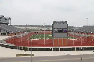 Heroes Stadium is an 11,000-seat, open style football stadium serving the public school district North East ISD in San Antonio, Texas, USA. It opened in 2009, built on the 58-acre (230,000 m2) site of the abandoned Longhorn Quarry, and has 2,525 paved parking spaces.[4] $27.5 million of funding was provided by a 2007 school district bond.[5] A video board system measuring 15 by 25 ft (4.6 by 7.6 m) was installed in 2010. Along with Comalander Stadium, Heroes is the home venue for the football, track and field, soccer, and band events for the high schools in the North East Independent School District, and also plays host to various athletic events for the district's middle and elementary schools.