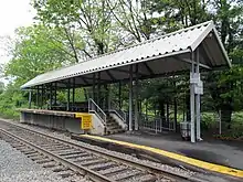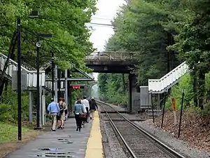The Needham cutoff opened on November 4, 1906, from West Roxbury to Needham Junction, allowing trains from the former New York and New England Railroad to reach Boston without needing to use the New York Central's Highland branch.[1] Building the cutoff required a significant length of difficult rock cuts - "one of the heaviest pieces of short railroad construction ever attempted in New England" - reaching a depth of 57 feet (17 m) at Great Plain Avenue.[4] Needham Junction was originally the only stop on the cutoff; Bird's Hill opened as an infill station at Great Plains Avenue in 1917.[1][5]