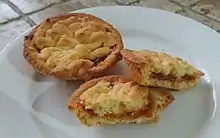 Hertzogkoekies are prepared from a pastry base with an open top that is filled with apricot jam. It is topped with a desiccated or grated coconut meringue topping and baked.[6][7]