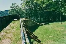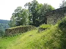 The northeastern flank was guarded by a 2.6-metre-wide, 3.5-metre-high and 110-metre long wall made of sandstone. This was in turn protected by a 3.5-metre-wide berm and a shallow ditch The wall on the inner side of the pincer gateway is only of single-leaf construction. The outer wall either side of the gateway approach on the hillside, was 2 metres wide and continued as a 55-metre-long wooden defensive breastwork. This probably enclosed the entire site. The gateway had a 1-metre-wide portal at the rear with a projecting wooden tower.