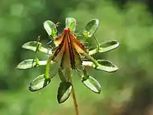 The false sepals (the spoon-like green bracts with prongs) are a distinguishing feature of the species.[2]
