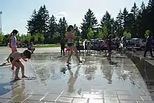 Plans for a dog park at the site were dropped in July 2006 when the city decided to build what became Hondo Dog Park at a different location.[11] Plans for 53rd Avenue Park were completed by December 2006, but construction did not begin as the city examined how to pay for the park's construction.[12] Funding for the first phase began to take shape in 2007 when the state gave Hillsboro a $500,000 grant from lottery funds for the initial construction.[13] This phase would cost $4 million and develop 10 acres (40,000 m2) at the 41-acre (170,000 m2) park with amenities including sports fields, two tennis courts, restrooms, parking, two basketball courts, lighting, and a courtyard that would include a fountain.[14] The Hillsboro Soccer Club also pledged $10,000 towards the project.[13] Construction began that year with the installation of an artificial turf covering to soccer fields.[15]