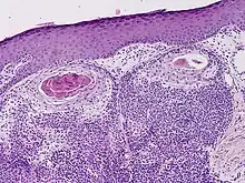 Hidradenocarcinoma (also known as malignant hidradenoma, malignant acrospiroma, clear cell eccrine carcinoma, or primary mucoepidermoid cutaneous carcinoma) is a malignant adnexal tumor of the sweat gland. It is the malignant variant of the benign hidradenoma. It may develop de novo or in association with an existent hidradenoma.[1]