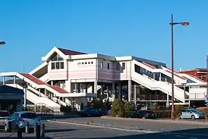 The station consists of two ground-level side platforms connected by an elevated station building. The station is unattended.