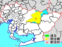 - On April 1, 2005 - The towns of Asuke, Asahi and Inabu, and the village of Shimoyama, along with the town of Fujioka, and the village of Obara (both from Nishikamo District), were all merged into the expanded city of Toyota. Therefore, Higashikamo District was dissolved as a result of this merger.