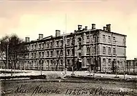 The curriculum of the officers' courses was inconsistent and sometimes contradictory to the teaching of junior officers at War School of Kaunas. To fix this, the war school was subordinated to the officers' courses from November 1923 for about two years.[18] In November 1923, the courses relocated from the city center to larger premises in Panemunė.[5] With the relocation, the courses were expanded by adding an artillery section. These artillery courses lasted two years and the first class of 15 men graduated on 15 July 1925.[19] Due to very different backgrounds and experience of the men, the courses had to spend a lot of time on teaching general subjects and in particular math before advancing to more specialized artillery topics. Therefore, the next class had to complete preparatory math courses and pass entrance examinations. This delayed the start date of the next artillery courses to November 1926.[20] The relocation also allowed the courses to establish courses for physical education instructors who would then teach soldiers gymnastics, fencing, and athletics. The physical education studies began on 10 July 1924.[21]