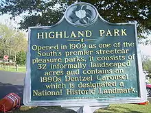 The history of Highland Park begins in the late 19th century when the area was used as the Meridian Fair and Livestock Exposition.[3] The organization, which was influenced by World's fairs such as the 1893 Chicago World's Fair and Atlanta's International Cotton Exposition in 1895, was founded in 1904 by big names in Meridian such as Israel Marks, the Threefoot brothers, and the Rothenbergs. They acquired land in west Meridian but never made any plans of what to do with it. When the Fair and Exposition Corporation dissolved in 1906, ownership of the land was transferred to a non-profit trust. After a city Park Association was formed in 1908,[4] the association was tasked with assembling property and developing initial plans for the park.[3]