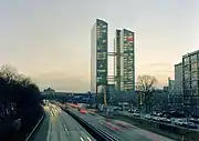 Highlight Towers is a twin tower office skyscraper complex completed in 2004 in Munich, Germany, planned by architects Murphy/Jahn of Chicago. Tower I is 126 m (413 ft) tall with 33 storeys, and Tower II is 113 m (371 ft) tall with 28 storeys, which make them among the highest buildings in the city. The towers are joined by two skyways made of glass and steel. Also in the complex are two low-rise buildings between the twin towers, that serve as a hotel and additional office space. Overall, the facility offers approximately 73,836 m2 (794,760 sq ft) of office space.