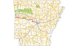 Arkansas Highway 10 is an east–west state highway in West Arkansas. The route runs 135.41 miles (217.92 km) from Oklahoma State Highway 120 near Hackett east to Interstate 30 in Little Rock, the state's capitol.[2] The highway serves both the Fort Smith metropolitan area and the Little Rock – North Little Rock – Conway metropolitan area.