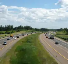 In the interim period, work went into expanding the six lane freeway through Toronto and Markham. A combination interchange was built with the new Highway 407 ETR which opened in June 1997, which as a prerequisite required the realignment of some ramps from the nearby Highway 7 interchange.[25] In early 1998, the MTO announced plans for two contracts to widen Highway 404 south of Highway 7. The first contract converted the grass median into an additional lane in each direction with a central concrete barrier between them, with the inner lanes to eventually be converted into HOV lanes. High-mast lighting was installed in the median barrier, replacing the unique luminaires that were mounted outside of the right shoulder of each direction. With the shift in road illumination completed as a prerequisite, the second contract would result in an additional lane in each direction on the outside the existing freeway south of Highway 407, making it ten lanes wide, with expansion of the southbound and northbound lanes completed in 2005 and 2007, respectively.[26][27][28] In 2002, Highway 404 was widened to six lanes between Highway 7 and Wellington Road, using the right-of-way afforded by the grass median.[6]