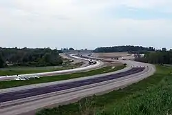 On May 16, 2006, the MTO announced plans to extend Highway 404 by 15 kilometres (9.3 mi) from Green Lane to Ravenshoe Road at the south end of Keswick. The first contracts were awarded later that year for the construction of the northbound bridge over Green Lane,[35] followed by two structures over Mount Albert Road, west of Woodbine Avenue, begun in late 2008 and completed in 2009.[36][37] By April 2011, the extension had been cleared and graded.[38] Completion was originally scheduled for December 15, 2012 with landscaping work to continue the following spring.[39][40] However, due to soil conditions and utility relocation issues, the project was delayed by nearly two years. The C$99 million extension opened on September 17, 2014.[41]