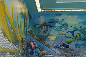 After returning to the United States, Hiler was named art director of the bathhouse building at the San Francisco Aquatic Park from 1936 to 1939, a major WPA project for which the bathhouse building (commonly known as the San Francisco Maritime Museum) was to be the centerpiece.[8] In addition to directing the overall design of the Streamline Moderne building, he created two full-room murals within the Maritime Museum. The first, in the main hall of the museum, recalls a playful, hallucinogenic dip into a richly populated aquatic landscape, and the other elucidates his color theories in the form of a circular, 120-color spectrum on the ceiling. When Henry Miller saw the aquarium-themed mural, he was so impressed that he considered it to be the only mural worth seeing in the United States.[5]