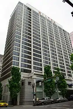 Contractors Andersen–Westfall built the original tower.[5] A region-wide strike by the Carpenters Union paused the project in April 1962 when union workers went on strike and picketed the construction site.[6] When the top full floor was finished in August 1962, the building became the tallest in Portland, overtaking the Public Service Building.[7] At that point the structure stood at 229 feet (70 m) tall and was scheduled to top out at 249 feet (76 m) when the penthouse was added.[7] The $12.5 million hotel was dedicated in May 1963 with a ceremony featuring Conrad Hilton, U.S. Senator Mark O. Hatfield, and Mayor Terry Schrunk.[8] At opening, it had 500 rooms, 5 restaurants and bars, 9 meeting rooms, and was designed as a convention center.[8] The Executive Tower, at 545 S.W. Taylor Street, stands kitty-corner from the original structure and was completed in 2002.