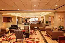 The hotel was listed as a Mobile 4-star and AAA 4-Diamond Luxury Hotel.[53] It was reported to be extremely expensive, with a high standard of formal attire expected.[54] The hotel features 372 guest rooms, 36 larger "Executive Rooms", and several suites on the top four floors of a 12-story mixed-use building.[44][55] Lonely Planet describes the hotel as "huge and stylish".[56] The ground floor is occupied by the hotel's lobby, with separate elevators for hotel guests and office tenants. The L’Enfant Plaza hotel had two main restaurants: The American Grill and the Foggy Brew Pub.[44][57] The facility had 21,000 square feet (2,000 m2) of meeting room space, which includes a main ballroom which seats 700.[44] It also featured two bars, concierge, a health club, and an outdoor pool.[58]