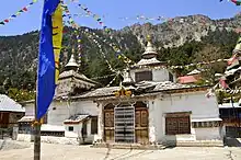 The religious structures[3] of Vajrayana Buddhism in the Himalayan belt are seen as Monasteries, Lhakhangs/ Gomphas and Chortens. In Mahayana Buddhism they are known as Chaityas, Viharas and Stupas, respectively.