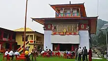 The Gompa[8] is typically located within the monastery complex and is designed to facilitate deep concentration and inner exploration. The space is usually large, with minimal furnishings, and may be decorated with symbolic images and objects that are relevant to the particular practices being undertaken.[9]