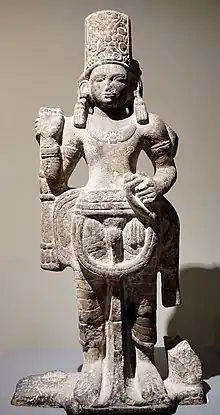 The human-sized sculpture of the second phase Vishnu with Pallava influence was discovered in Sri Mahosot in Central Thailand. Vishnu is attired in a plain cylindrical crown along with a transparent lower garment. The style of the sculpture shares a similarity with the ones discovered in Southern Thailand.[12][13]