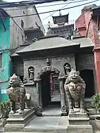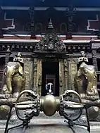 On the courtyard side the entrance is flanked by two golden elephants standing on tortoises. Above the door is a gilt copper torana. This torana was originally located at the main shrine, but was replaced there by a silver copy, donated during the reign of king Prithvi Bir Bikram Shah (1881-1911).[10]