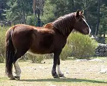 The Hispano-Bretón is a Spanish breed of horse developed by crossing native Pura Raza Española horses with imported Breton draught horses. The breed is found mainly in two separate areas of northern Spain: Castile and León and parts of neighboring Cantabria; and the Pyrenees of Catalonia. The Hispano-Bretón is listed in the Catálogo Oficial de Razas de Ganado de España in the group of autochthonous breeds in danger of extinction. [1]