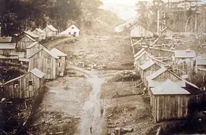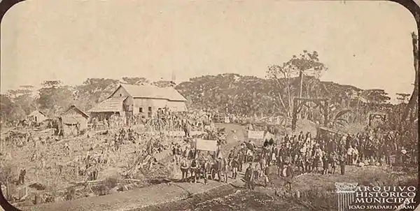 They were mostly young families from the Veneto region, making up about 71% of the total. Approximately 23% of them were Austrians from the Tyrol (Trento region), 2% Brazilians, and the rest from other origins such as France, Spain, and England.[10] The lots were chosen by the immigrants themselves from among those available, were not free, and had to be repaid to the government in a few years. Once the choice was made, they received a provisional ownership title and moved to other shacks in the "crossings" or "lines", the first roads, and began the work of their settlement, cutting down the forest, building the house, and planting the first subsistence crops. While the house was not ready and agriculture did not bear its fruits, their sustenance came from gathering, hunting, selling wood, some official aid in cash and food, and from working for the government, taking part in the demarcation of new lots and the opening of roads. However, not all were farmers, a portion of the immigrants practiced trades and moved to the urban centers. The farmers established residence in the rural area, on the land received, and those who had more resources also acquired plots in the Sede. In 1877, when the area was named "Colônia Caxias", there were already about two thousand people settled.[11]