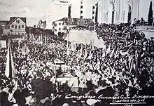 Shortly afterward, on 30 June 1894, the Federalist Revolution reached Caxias do Sul and left a trail of destruction. The city was invaded by 400 revolutionaries commanded by Belisário Baptista de Almeida Soares, who looted the commerce and attacked public buildings, forcing the population to take refuge in the countryside.[22] The local presence of Freemasons and Carbonari also caused riots and violence especially against the religious, setting traps for them, assaults, and assassination attempts, thus dividing the community and forcing some of the first priests to carry guns or move to other places. Antonio Passaggi, the first chaplain of the colony, was on one occasion the victim of a trap, when anticlerical individuals arranged a fake wedding between two men, one of them in drag. When the plot was discovered, the priest was punished, stripped of his functions, and deprived of holy orders by the bishop, while the real culprits remained free. In 1898, Father Pietro Nosadini, who had already been kidnapped and almost killed in 1897, wrote an open letter to the government denouncing the slander that involved him in the attempt on the life of the Intendant José Cândido de Campos Júnior, and other facts revealing the climate of intrigue, animosity, and incomprehension that reigned between the church and local politicians. Peace was only established when Father Antonio Pertile took over the direction of the parish, whose tombstone bears the title Pacificatore di Caxias.[23][24] These various conflicts, besides their specific and punctual characteristics, were also a reflection of the intense struggle for power at the state level, where currents of republicans and federalists fought, each subdivided by influences of divergent ideologies of conservatives, liberals, Catholics, Freemasons, and other interest groups, making the state one of the most unstable areas in Brazil at this time, and making the passage from the 19th to the 20th century the most turbulent period in Caxias' history.[25]