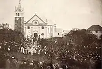 These heterodox customs, born spontaneously from popular need, given the scarcity of priests to serve a vast territory, soon came into conflict with the regularly established ecclesiastical authority, but the role of the "lay priest" in the colonizing society was of enormous importance. Even when itinerant priests came to the aid of the faithful, there was little adherence to orthodoxy. The chronicles of these missionaries lament that the people took a great part in religious festivities, but shunned confession and communion.[29] Nevertheless, in 1893, the Church was able to begin the construction of the Cathedral of Caxias do Sul, today the seat of the Bishopric, thanks to the joint effort of the immigrant community, which worked on the construction for free and paid out the high sum of 150 contos de réis up to the date of its inauguration in 1899, when all the façade covering and internal decorations were still missing. At the solemn consecration of the temple on 15 October 1900, Bishop Ponce de Leão confirmed 5,000 people.[30]
