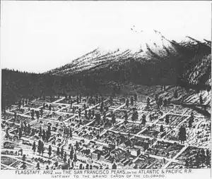 The town was known by different names when the Atlantic and Pacific Railroad was being built through the area in 1882.[22][26] It may have been known as Flagstaff Spring for a while, and 'Old Town Spring' after this before simply 'Old Town'.[10][lower-alpha 2] The name 'Old Town' was given to the original settlement either before or after a fire destroyed it. For the former, the story goes that the railroad depot was moved by half a mile to avoid hill starts, and business owners soon followed it, displacing the commerce of the town to Front Street of 'New Town' while the houses were still in 'Old Town' with the spring; when the fire burned down 'Old Town', 'New Town' remained.[31] For the latter, the story says that after the fire destroyed much of the town, a new community was then raised a few hundred yards away and called 'New Town', deeming the burnt-out area the 'Old Town'.[10] Local Moenkopi red sandstone had been used as the foundation for many of the buildings in town, and is fire-resistant; it soon became the choice building material for complete structures.[32] The name Flagstaff was reinstated in 1884 when a post office was introduced alongside the railroad depot.[10][22][26]