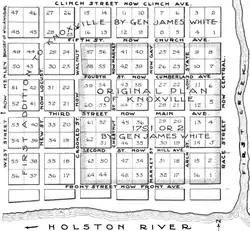 While Blount initially sought to place the territorial capital at the confluence of the Clinch and Tennessee rivers (near modern Kingston), where he had land claims, he was unable to convince the Cherokee to completely relinquish this area, and thus settled on White's Fort as the capital.[13]:6–7 James White set aside land for a new town, which initially consisted of the area now bounded by Church Avenue, Walnut Street, First Creek, and the river, in what is now Downtown Knoxville.[17] White's son-in-law, Charles McClung, surveyed the land and divided it into 64 half-acre lots.[15] Lots were set aside for a church and cemetery, a courthouse, a jail, and a college.[15]