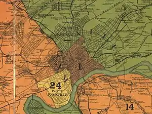 Knoxville's first major annexation following the Civil War came in 1869, when it annexed the city of East Knoxville, an area east of First Creek that had incorporated in 1856.[42]:137–8 In 1883, Knoxville annexed Mechanicsville, which had developed just northwest of the city as a village for Knoxville Iron Company and other factory workers. In the 1870s and 1880s, the development of Knoxville's streetcar system (electrified by William Gibbs McAdoo in 1890) led to the rapid development of suburbs on the city's periphery.[23]:100–101 Neighborhoods such as Fort Sanders, Fourth and Gill, Old North Knoxville, and Parkridge, are all rooted in "streetcar suburbs" developed during this period.