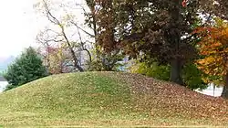 The first humans to form substantial settlements in what is now Knoxville arrived during the Woodland period (c. 1000 B.C. – 1000 A.D).[3] Knoxville's two most prominent prehistoric structures are Late Woodland period burial mounds, one located along Cherokee Boulevard in Sequoyah Hills, and the other located along Joe Johnson Drive on the University of Tennessee campus.[4] Substantial Mississippian period (c. 11001600 A.D.) village sites have been found at Post Oak Island (along the river near the Knox-Blount line),[5] and at Bussell Island (near Lenoir City).[6]