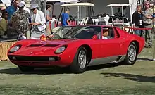 The car's rolling chassis, featuring an unusual transversely mounted mid-engine layout, was displayed at the Turin Salon in 1965, impressing showgoers. A version with bodywork styled by Bertone designer Marcello Gandini was finished only days before its debut at the 1966 Geneva motor show. As had happened three years earlier at the debut of the 350GTV, an ill-fitting engine meant the prototype's engine bay was filled with ballast, and the engine compartment was kept locked.[13] The favorable reaction to the P400 at Geneva led Lamborghini to slate the car for production by 1967, under the name Miura. The Miura's layout and styling would become the standard for mid-engine two-seat high-performance sports cars,[14] a trend that continues today.