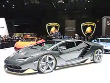 The Gallardo's replacement, the Huracán LP610-4, was announced in December 2013, and made its worldwide debut at the 2014 Geneva Motor Show.[69] The Huracán presents significant improvements over the Gallardo, such as a power output increase to 610 PS (602 hp; 449 kW), a 0–97 km/h (0–60 mph) time of 3.2 seconds, a top speed of 325 km/h (202 mph) and the use of a dual-clutch transmission. The convertible version, called the Huracán Spyder would follow up at the 2015 Frankfurt Motor Show[70] followed up by the low cost, rear wheel drive LP580-2 coupé and convertible models in 2016, having the V10 engines detuned to 580 PS (572 hp; 427 kW) while remaining in par with performance as the "base" LP610-4 models.[71] The most powerful iteration of the Huracán, the LP640-4 Performante, was unveiled at the 2017 Geneva Motor Show having the power increased to 640 PS (631 hp; 471 kW) and using the forged carbon fibre body components from the Sesto Elemento in order to achieve a 0–97 km/h (0–60 mph) time of 2.9 seconds and a top speed as high as 351 km/h (218 mph).[72] along with achieving a lap time of 6:52.01 on the Nürburgring Nordschleife,[73] with Marco Mapelli behind the wheel, making it one of the world's fastest production car around the track, only to be beaten by the Porsche 911 GT2 RS later that year which set a lap time of 6:47.03[74]