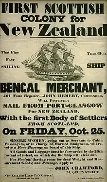 "First Scottish Colony for New Zealand" – 1839 poster advertising emigration from Scotland to New Zealand. Collection of Kelvingrove Art Gallery and Museum, Glasgow, Scotland.