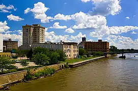East Saginaw Historic Business District, and in the center distance, the Michigan Bell Building, both of which are on the National Register of Historic Places.