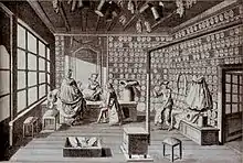 Outside the major metropolitan cities, few stores could afford to serve one type of clientele exclusively. However, gradually retail shops introduced innovations that would allow them to separate wealthier customers from the "riff raff." One technique was to have a window opening out onto the street from which customers could be served. This allowed the sale of goods to the common people, without encouraging them to come inside. Another solution, that came into vogue from the late sixteenth century was to invite favored customers into a backroom of the store, where goods were permanently on display. Yet another technique that emerged around the same time was to hold a showcase of goods in the shopkeeper's private home for the benefit of wealthier clients. Samuel Pepys, for example, writing in 1660, describes being invited to the home of a retailer to view a wooden jack.[42] The eighteenth-century English entrepreneurs, Josiah Wedgewood and Matthew Boulton, both staged expansive showcases of their wares in their private residences or in rented halls.[43]