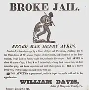 In 1835 slaveowners in Jefferson County petitioned the General Assembly for redress for the loss of runaway slaves. In response, the General Assembly passed an act incorporating "The Virginia Slave Insurance Company" in Charlestown.[66] The Fugitive Slave Act returned a number of slaves to western Virginia. Just before the Civil War a slave belonging to the Jackson family in Harrison County escaped to Ohio by stealing a horse, but was returned under the act and sold lower south.[67] One of the last slaves ever returned under the act was Sara Lucy Bagby, who had also escaped to Ohio and was restored to her owner in Wheeling on January 24, 1861.[68] Sara Bagby was freed during the war and moved to Pittsburgh.[69] Slaves who ran away and were returned, or at risk of flight, were often sold. In 1856 in Point Pleasant, Mason County, two slaveholders sold their eighteen slaves for $10,600 (~$270,736 in 2022) to a Richmond dealer when it was discovered that they had been planning an escape.[70] A slave owner in Kanwaha County sent his remaining slaves to Natchez for sale after two had run away.[71]