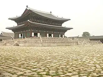 Following the struggle between the emerging Ming dynasty under Zhu Yuanzhang (the later Hongwu Emperor) and the Mongol Yuan dynasty, Goryeo remained neutral with its monarchs attempting to maintain friendly diplomatic relations with both as the conflict remained inconclusive.[2] The royal court in Goryeo split into two factions: the group led by General Yi (favouring the militarily more powerful Ming) and the camp led by General Choe (royalists standing by the Goryeo royal family). When a Ming messenger came to Goryeo in 1388 (the 14th year of King U) to demand the return of a significant portion of Goryeo's northern territory, General Choe seized the chance and argued for the invasion of the Liaodong Peninsula. (Goryeo was the successor state of the ancient kingdom of Goguryeo; as such, restoring Manchuria as part of Korean territory was part of its foreign policy throughout its history.) A staunchly opposed Yi was chosen to lead the invasion; however, at Wihwa Island on the Yalu River, he revolted and traveled back to Gaegyeong (modern-day Gaeseong and the capital of Goryeo). He proceeded to eliminate General Choe and his followers and began a coup d'état, overthrowing King U in favor of his son, King Chang, in 1388. He later killed King U and his son after a failed restoration and forcibly placed a royal named Yo on the throne, who became King Gongyang. After indirectly enforcing his grasp on the royal court through the puppet king, Yi proceeded to ally himself with members of the Sinjin aristocracy, such as Jeong Dojeon and Jo Jun. One of his first acts as the de facto generalissimo of Goryeo was to pass the Gwajeon Law, which effectively confiscated land from the wealthy and generally conservative Gwonmun aristocrats and redistributed it among Yi's supporters in the Sinjin camp. In 1392 (the fourth year of King Gongyang), Yi's fifth son, Yi Bang-won, after failing to persuade a noteworthy aristocrat named Jeong Mong-ju, a supporter of the old dynasty, to swear allegiance to the new reign, had Jeong Mong-ju killed by five assassins, including Jo Yeong-gyu, at Seonjuk Bridge near Gaegyeong, eliminating a key figure in the opposition to Yi Seong-gye's rule. That same year, Yi dethroned King Gongyang, exiled him to Wonju, and ascended the throne. The Goryeo dynasty had come to an end after almost 500 years of rule.