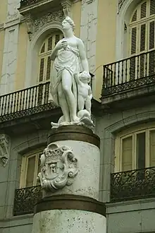 Between 1630 and 1838, the first place went to the Fuente de la Mariblanca, also known as the Fuente de la Fe, Fuente del Buen Suceso, Fuente de Venus or Diana (depending on which chronicler), Fuente de las Arpías (by the mythological beings called Harpies, that surrounded its pedestal) or "Primera Fuente Ornamental de la Puerta del Sol" (First Ornamental Fountain of the Puerta del Sol).[31][32][33][34]