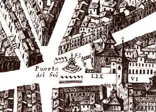 In 1478 Puerta del Sol is mentioned as an urban entity and in 1481 it is mentioned in documents, for the first time, in the description of a popular trial regarding the demarcation of the jurisdictions of the parishes of San Ginés and San Martín, both in dispute since long ago. The parish of San Ginés had expanded its area to occupy the arrabal of Arenal (today Calle del Arenal), extending its influence to what is now Calle Preciados. This expansion threatenedly extended towards the limits of the parish of San Martin (located further north, in a place near the current Plaza del Callao), which gave rise to the aforementioned trial.[14] Also dating from this period are the writings on the requests made by Juan de Madrid for a plot of land located in the Puerta del Sol (also one of the first documents to explicitly mention it as such).[15] In 1498 it was ordered to surface the "calle grande de la Puerta del Sol" (referring to what would later become the square), and in 1501 a municipal provision ordered the "paving of the calle grande de la Puerta del Sol for the entrance of the princes".[16][17] The space, due to the large number of citizens, was used to make official announcements to the city.