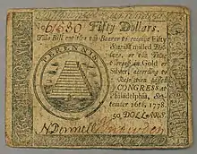 After the American Revolutionary War began in 1775, the Continental Congress began issuing paper money known as Continental currency, or Continentals. Continental currency was denominated in dollars from $1⁄6 to $80, including many odd denominations in between. During the Revolution, Congress issued $241,552,780 in Continental currency.[1] By the end of 1778, this Continental currency retained only between 1⁄5 to 1⁄7 of its original face value. By 1780, Continental bills – or Continentals – were worth just 1⁄40 of their face value. Congress tried to reform the currency by removing the old bills from circulation and issuing new ones, but this met with little-to-no success. By May 1781, Continentals had become so worthless they ceased to circulate as money. Benjamin Franklin noted that the depreciation of the currency had, in effect, acted as a tax to pay for the war.[2] In the 1790s, after the ratification of the United States Constitution, Continentals could be exchanged for treasury bonds at 1% of face value.[1]