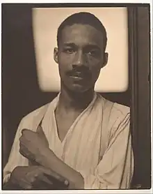 In the portrait, the dark skin of Kirnon’s fingertips trace the white fabric of his shirt, and he tugs at his suspenders in a subtle gesture toward the menial job he had taken to support his intellectual and cultural work: to lift viewers from the restless sidewalks of Midtown Manhattan to the attic-level artistic center... In the elevator, he crossed paths with artists—many of them foreigners and outsiders engaged in their own struggle of “getting up,” as the German-born painter Oscar Bluemner once put it, of negotiating the “vertical of American society”—who occasionally invited Kirnon into the inner sanctum of their circle.[10]