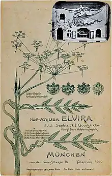 The new studio building that housed the Munich atelier at Von-der-Tann-Strasse 15, built in 1898, became a prominent structure in the style of Art Nouveau, and the façade was a design by the architect August Endell in the years from 1896 to 1898. Endell's work was influenced by Victor Horta. His plans, were licensed in April 1898 with the remark, that they were a "mockery of drawing art".[1] The façade, with its red and golden dragon-like stucco ornament on a green ground,[2] was especially criticized. The design was called "Octopus Rococo", and the building was variously called the "dragon's castle" or the "Chinese embassy".[3] The Atelier Elvira building was an artist's meeting point from the beginning. Soon after the building was completed, the founders' paths went separate ways. In 1907 Augspurg sold her share to Goudstikker, who later leased it to the young photographer Emma Uibleisen. After World War I most of the traditional clients disappeared. When Uibleisen died in 1928 there was no successor.