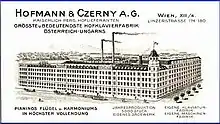 Hofmann & Czerny AG [not to be confused with other piano makers such as Ferdinand Hofmann (ca. 1756–1829), August Hoffmann, George Hoffmann, W. Hoffmann, Karl Hofmann, Hofmann & Scholz or Hofmann & Schulze] was founded in 1903 by Julius Carl Hofmann (b. 1873, Bohemia. d. 1948, Vienna[1]) in Penzing (Vienna) and was known as Europe's largest piano manufacturer at the time.[2] It was awarded the Austrian coat of arms on June 11, 1931, as it used to be the imperial court's personal piano supplier.[2] The company produced and sold world famous pianos under the name "Hofmann" and later as "Hofmann & Czerny". The company began producing pianos in its factory under license in 1924. The pianos were also produced in Czechoslovakia under "Jihlavská továrna, a.s." generated under license.