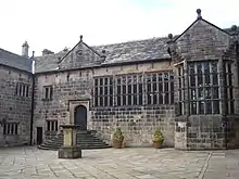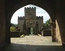 The house is approached by a long straight drive leading eastwards from the A675 road. It passes through a pair of gate piers about 200 yards (183 m) west of the house.[27] Between these gates and the entrance to the outer courtyard is a grassed area known as the Tilting Ground, which is enclosed by a wall on the south side and the Great Barn to the north. On the east side of the house is a walled garden, known as the Wilderness, and on the south side are smaller walled gardens, the Rose Garden and the Rampart Garden.[21] The Great Barn is constructed in sandstone with a slate roof, and incorporates a carthouse. It is dated 1692, and has ball finials on its gables. To the northwest of the house are the coach house and stables, also in sandstone, and dating from the 17th or early 18th century. A small cupola was added to it in the 19th century. At the entry to the drive on the main road is Paley and Austin's lodge of 1878.[21]